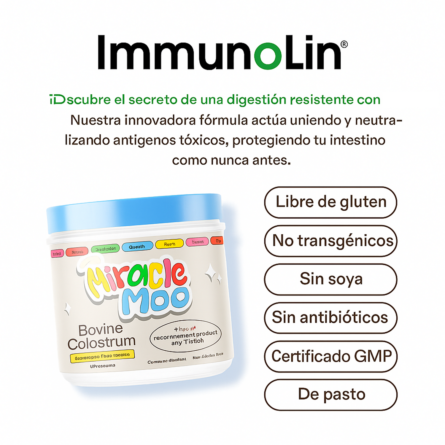 IMMUNOLIN: El único calostro que contiene ImmunoLin, diseñado para llevar tu bienestar al siguiente nivel. Mejora tu salud intestinal, potencia tu inmunidad y ayuda a protegerte de infecciones.